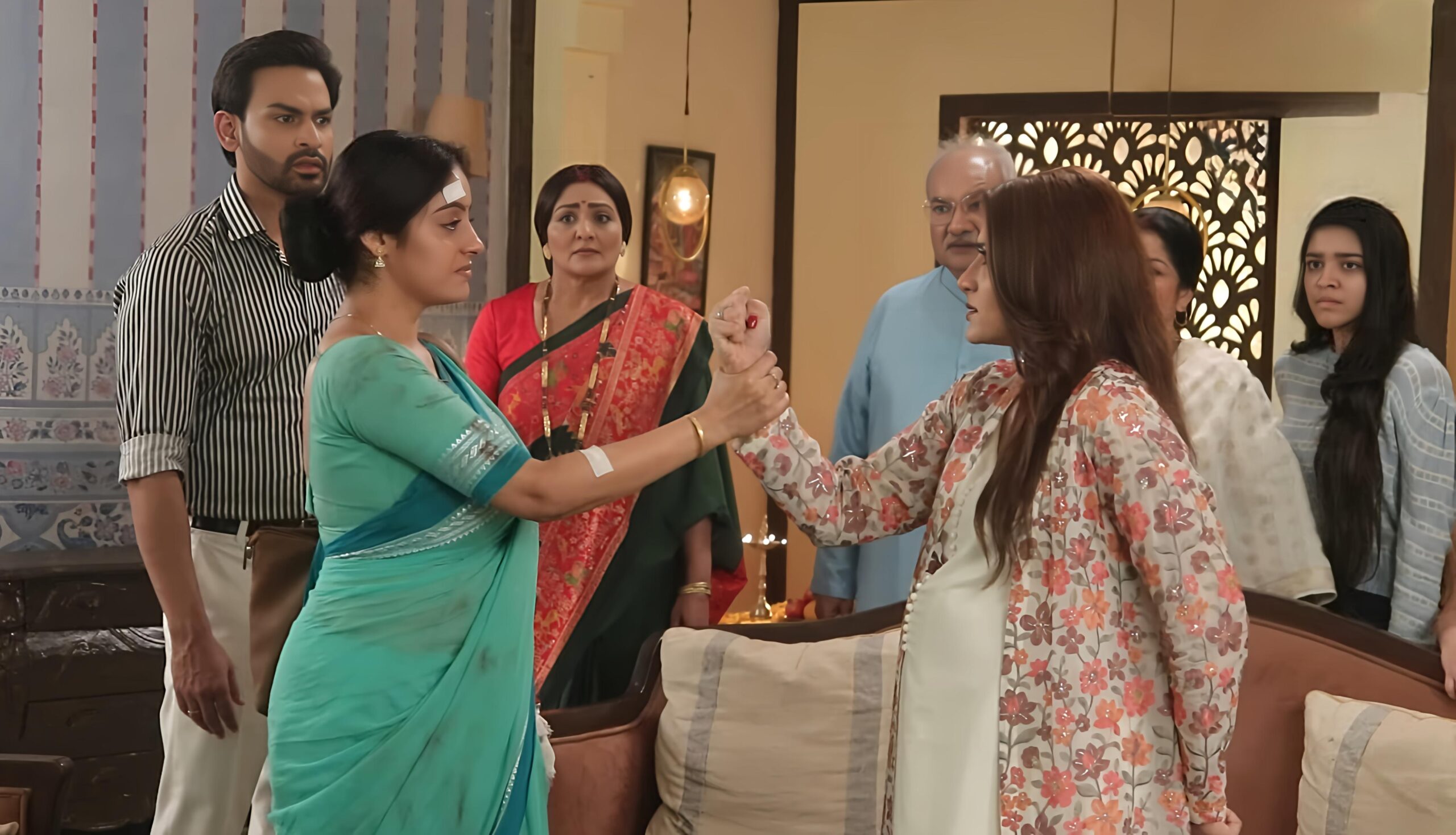 Mangal confronts Sowmya head-on, stating that Sowmya has lost everything — her authority, her plans, and even Adit. This harsh truth pushes Sowmya to the edge, and in a fit of rage, she attempts to slap Mangal. However, Mangal courageously stops her hand, symbolizing her complete control over the situation. The tension peaks when Kusum steps in, firmly holding Sowmya’s hand and decisively ousting her from the house.